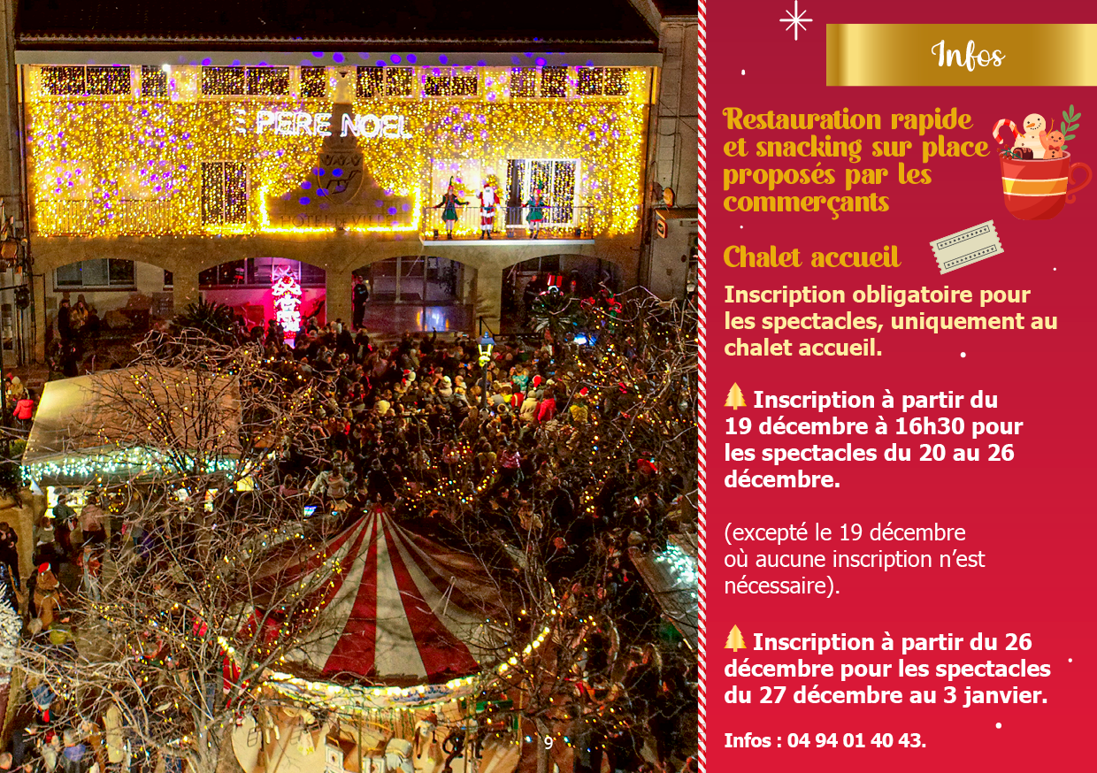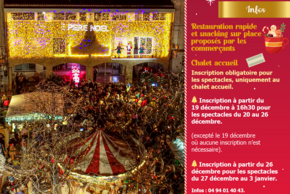 • Inscription à partir du 19 décembre aux horaires d’ouverture de l’Aire de Noël pour les spectacles du 20 au 26 décembre.