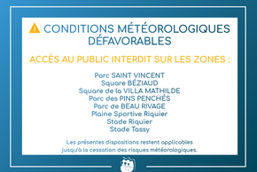 En raison des conditions météorologiques annoncées sur le territoire de la Commune, risquant de provoquer des chutes d’arbres sur certains sites, l’accès est interdit à l’intérieur des squares, parcs et espaces publics suivants :