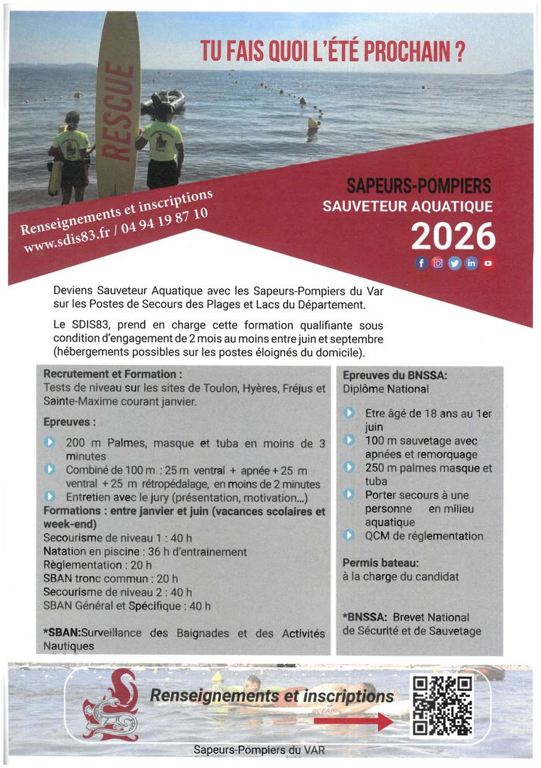 Le cursus de formation comprend les formations liées aux premiers secours en équipe, le Brevet National de Sécurité et de Sauvetage Aquatique (B.N.S.S.A.) et une formation sur les techniques spécifiques de sauvetage en mer et de pilotage d'embarcation. L'intégralité du cursus hors permis bateau est pris en charge par le SDIS83 sous réserve de participer pendant au moins deux mois à la surveillance des plages entre juin et septembre.