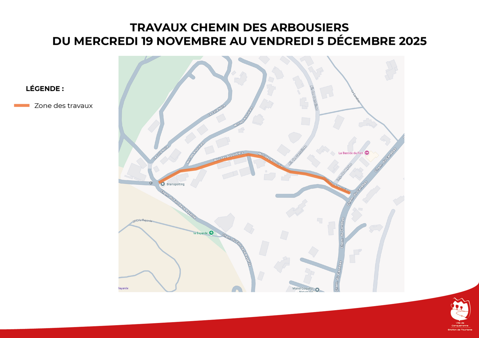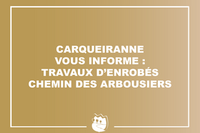 Travaux Travaux d'enrobés chemin des ArbousiersDes travaux d’enrobés vont être entrepris Chemin des Arbousiers à partir de demain, mercredi 19 novembre jusqu’au vendredi 5 décembre inclus.Publié le 18 novembre 2025 Merci de votre compréhension pour la gêne occasionnée. PrécédentRetour à la listeSuivant