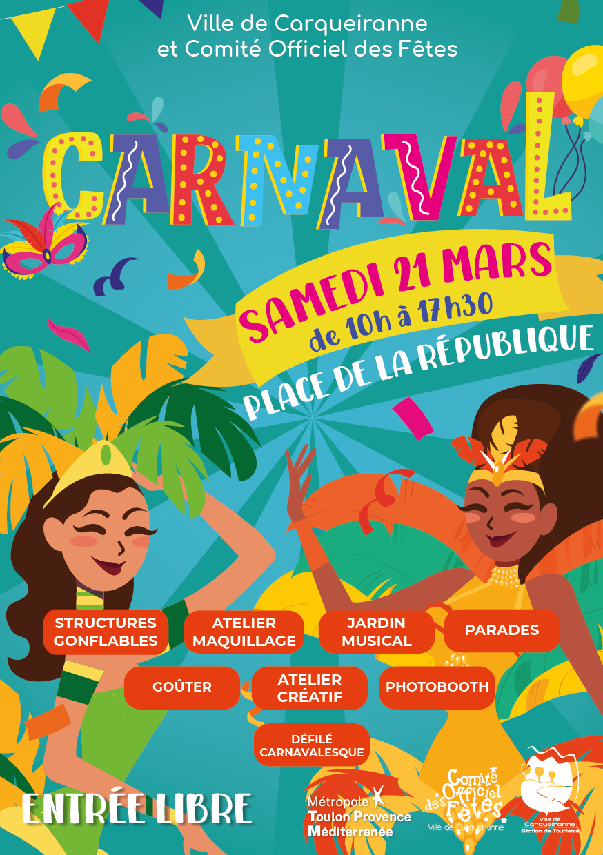 La Ville de Carqueiranne a le plaisir de vous annoncer que le Carnaval est reporté au samedi 21 mars 2026, de 10h à 17h30 sur la place de la République !