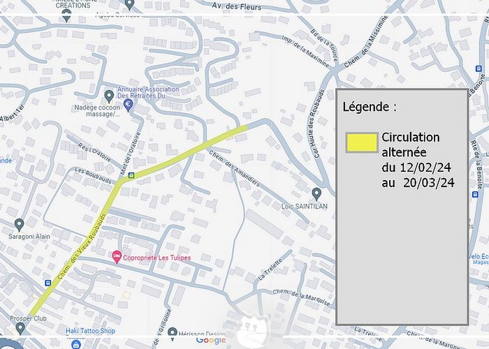Les travaux de réfection de l’enrobé (chaussée et trottoir) situé au Chemin des Vieux Roubauds (cf. plan en visuel) auront lieu du lundi 12 février 2024 au mercredi 20 mars à 16h.