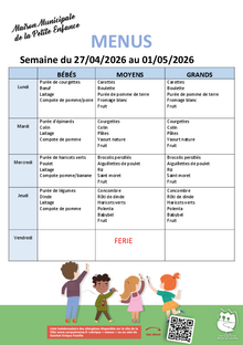 Jeunesse Menus crèche semaine 18 1 document Publié le 07 avril 2026 MENU_CRECHE_SEMAINE_18.pdf (.pdf, 486,0 Ko) Télécharger PrécédentRetour à la listeSuivant