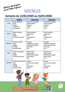 Menus crèche semaine 3 1 document Publié le 07 janvier 2026 MENU_CRECHE_SEMAINE_3.pdf (.pdf, 486,1 Ko) Télécharger PrécédentRetour à la listeSuivant