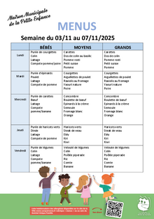 Menus crèche semaine 45 1 document Publié le 29 octobre 2025 MENU_CRECHE_SEMAINE_45.pdf (.pdf, 479,1 Ko) Télécharger PrécédentRetour à la listeSuivant