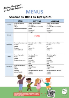 Education Menus crèche semaine 46 1 document Publié le 29 octobre 2025 MENU_CRECHE_SEMAINE_46.pdf (.pdf, 486,3 Ko) Télécharger PrécédentRetour à la listeSuivant