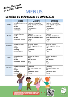 Jeunesse Menus crèche semaine 8 1 document Publié le 28 janvier 2026 MENU_CRECHE_SEMAINE_8.pdf (.pdf, 485,6 Ko) Télécharger PrécédentRetour à la listeSuivant