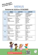 Dans la même rubriqueSélectionner dans la même rubriqueMenus commentésP'tits critics gastronomics Menus Menus des restaurants scolaires S'abonnerToutes les publications Jeunesse Menu des restaurants scolairesPDF - 2,4 Mo Télécharger Menus de la crèche S'abonnerToutes les publications Menus crèche semaine 41PDF - 479,6 Ko Télécharger Education Menus crèche semaine 42PDF - 479,4 Ko Télécharger Jeunesse Menu crèche semaine 43PDF - 479,2 Ko Télécharger Pour information, les menus "dîners" et "week-end" concernent uniquement la Résidence Wetzel et le portage à domicile.
