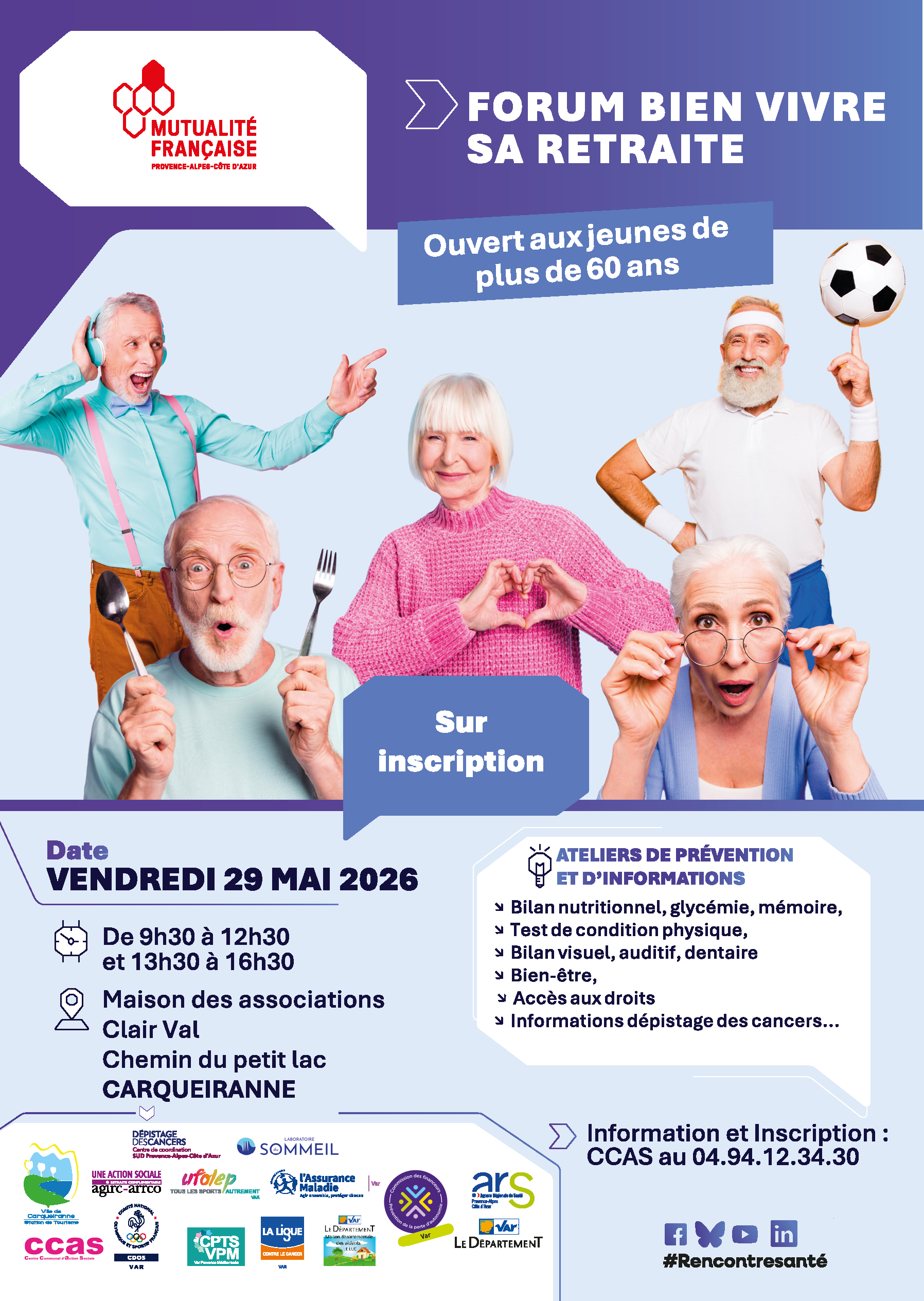 Le CCAS en collaboration avec la Mutualité Française, organise une journée dédiée aux « jeunes de plus de 60 ans » avec le forum « Bien vivre sa retraite » le vendredi 29 mai de 9h30 à 12h30 et de 13h30 à 16h30 à la Maison des Associations Clair-Val.