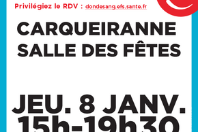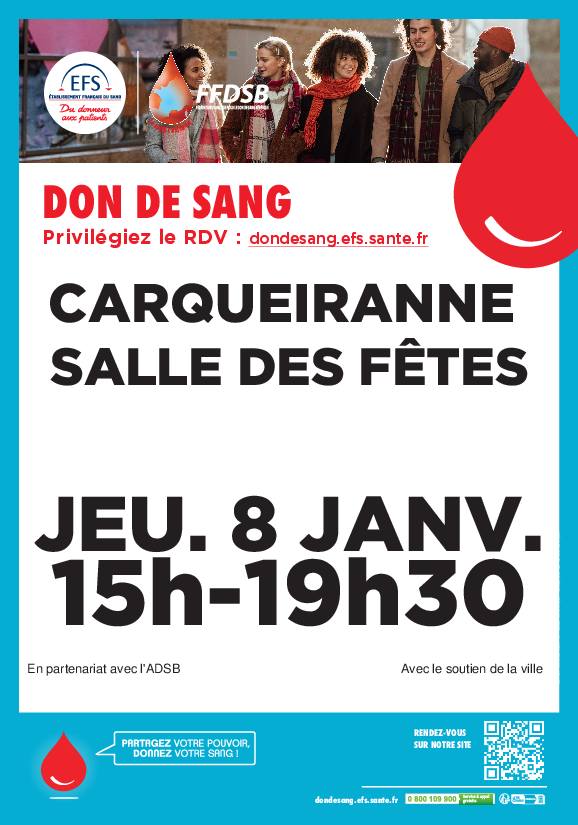 L’Établissement Français du Sang organise une collecte de sang le jeudi 8 janvier en salle des fêtes de l’Hôtel de Ville de 15h à 19h30.