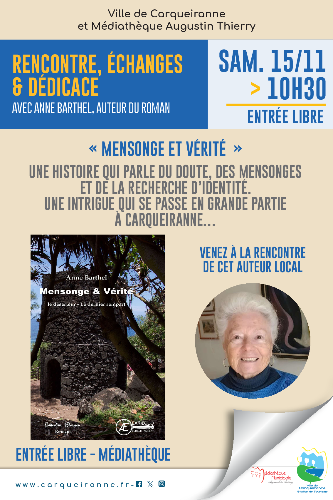 Venez rencontrer l’auteur local Anne Barthel avec son dernier roman « Mensonge et Vérité » dont l’intrigue se passe en grande partie à Carqueiranne.